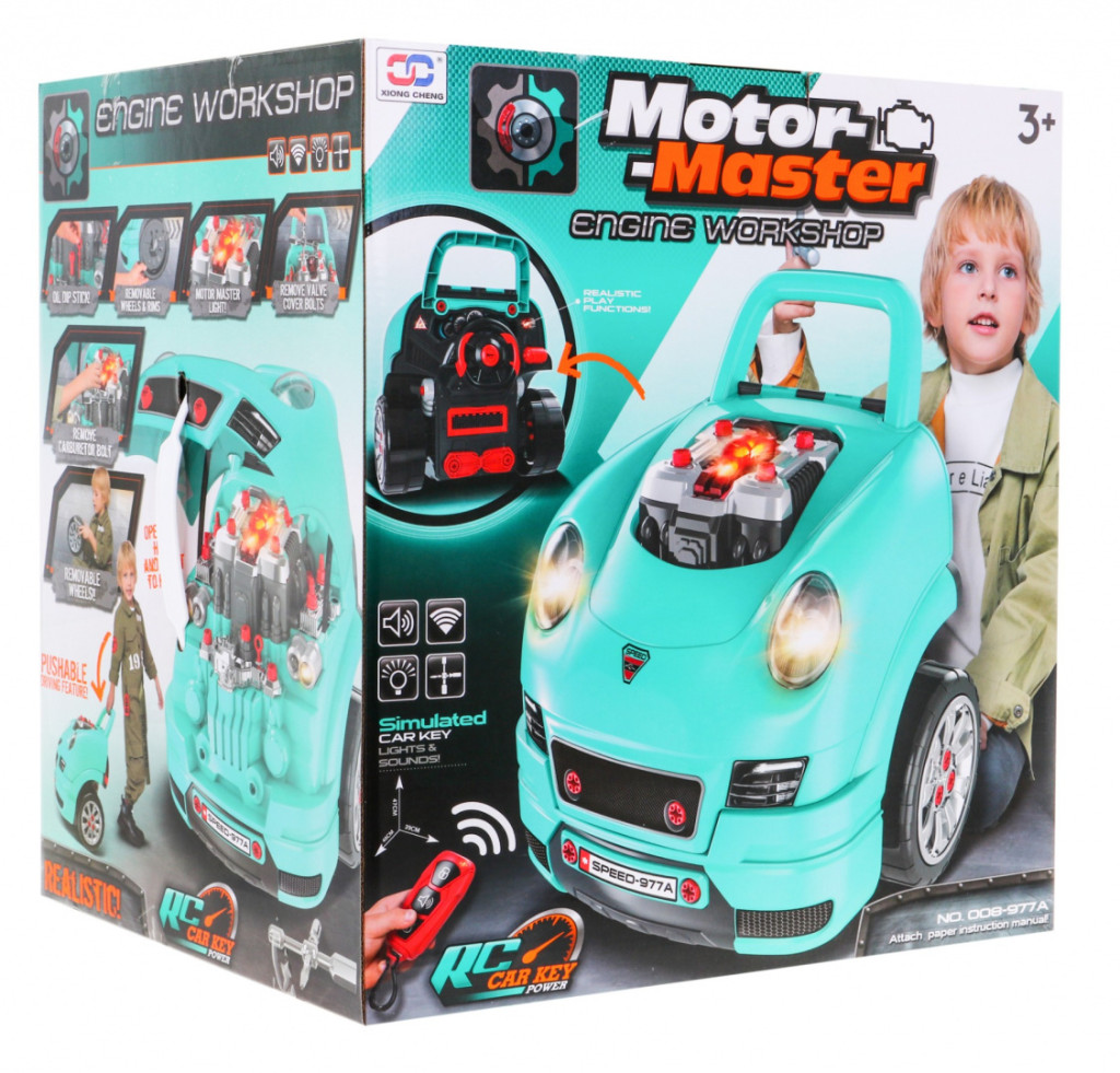 Absolutny hit, przód samochodu z podnoszoną maską, kierownicą oraz deską rozdzielczą z drugiej strony. Zestaw przeznaczony jest dla dzieci od 3-go roku życia. Pod maską znajduje się mnóstwo elementów do montażu i demontażu. Twoja pociecha będzie mogła dokonywać naprawy silnika, świec zapłonowych, a nawet kół. Na desce rozdzielczej znajduje się przycisk startu pojazdu z odgłosami zapalania silnika, kierownica z klaksonem oraz sygnalizator awaryjny. Pod kierownicą umiejscowiony jest schowek, do którego można schować wszystkie niezbędne narzędzia, śruby, pokrętła. Zestaw zawiera pilota, który umożliwia sterowanie modułami świetlnym (świecące reflektory i góra silnika) i dźwiękowymi (odgłos otwierania i zamykania samochodu, klakson). Zabawka posiada wygodną rączkę do przenoszenia. Zasilanie bateriami typu 3 x AA 1,5 V – auto (brak w zestawie), CR2025 3V- pilot (w zestawie).