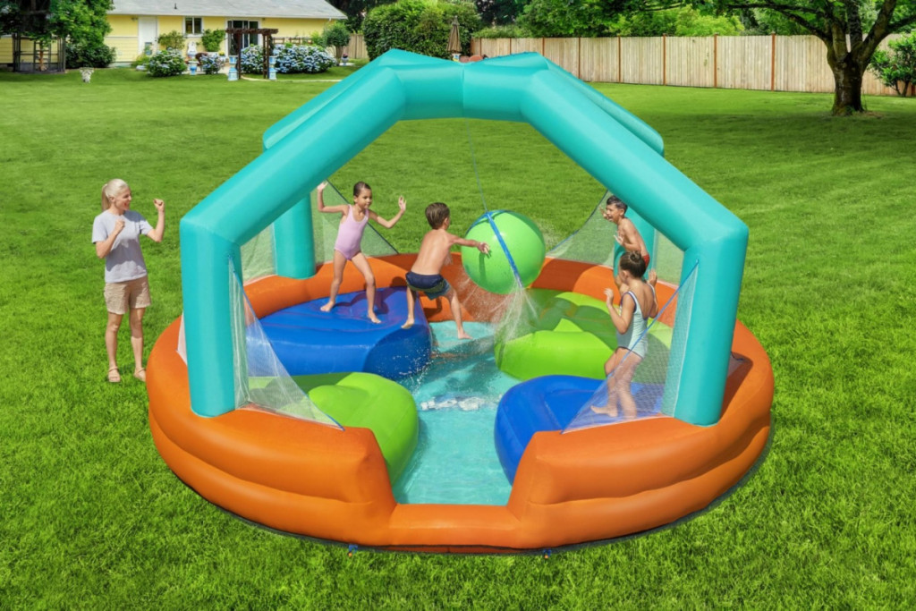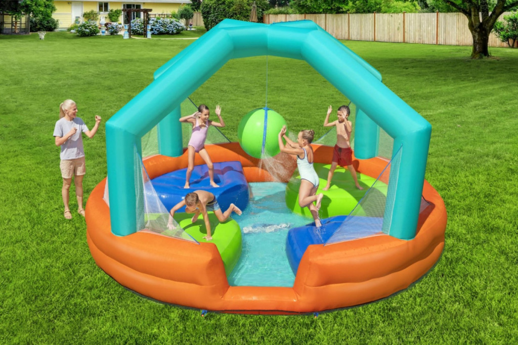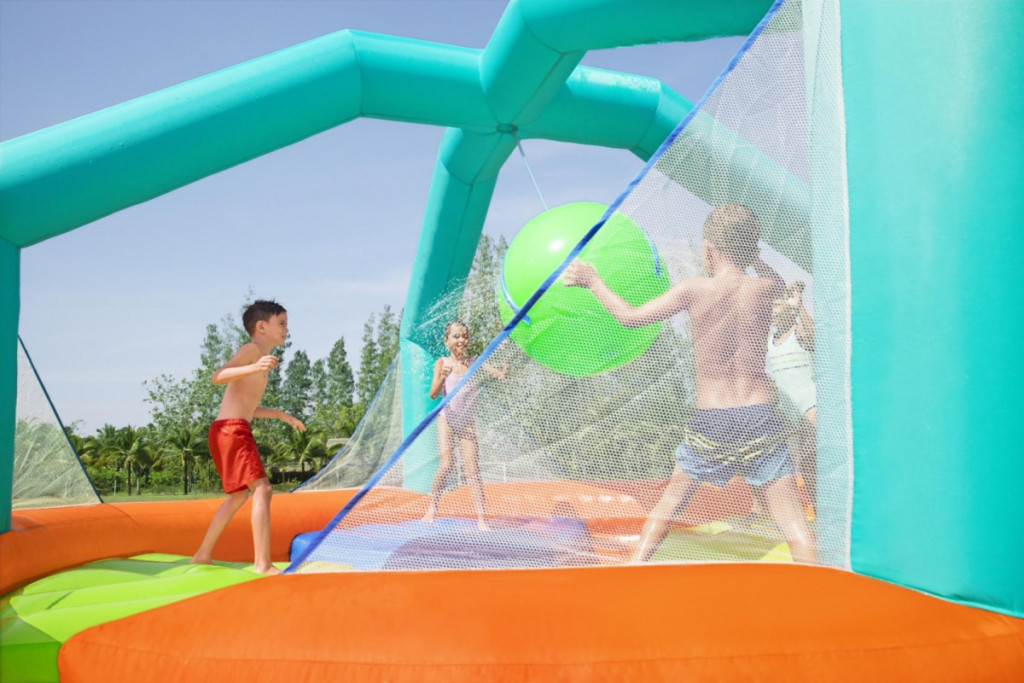 Felfújható játszótér a Bestway márkátólA meleg napok a kertben kedvencei lesznek a Bestway felfújható játszóterével. Ez a színes és vonzó vízi játszótér több órányi izgalmas szabadtéri szórakozást biztosít a gyerekeknek. A tartós, PVC-vel borított poliészterből készült, kb. 450 x 450 x 268 cm-es játszótér ideális megoldás aktív 5 éves és nagyobb gyermekek számára.