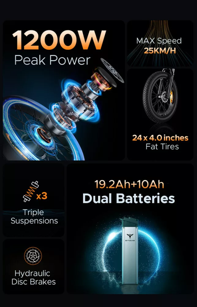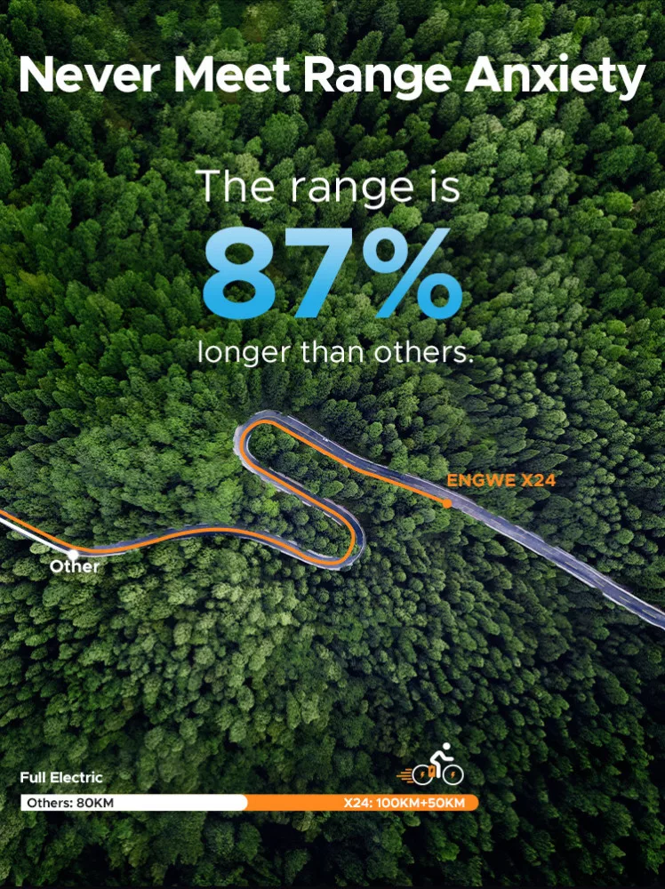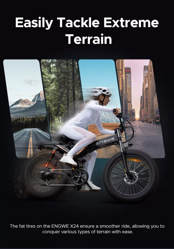 ENGWE X24 Super E-bike nagy teljesítményű kerékpár, gördülékeny utazás minden terepen. Határozd meg új a céljaidat, következő kalandod itt kezdődik az ENGWE X24-el. Utazz korlátozás nélkül, bárhová is visz az út.
