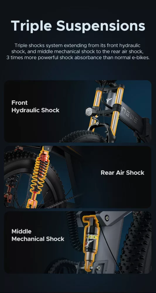 Az ENGWE X24 háromszor erősebb lengéscsillapítást kínál, mint egy átlagos e-bike. Ezt egy hármas lengéscsillapító rendszer teszi lehetővé, amely magában foglal egy első hidraulikus lengéscsillapítót, egy középső mechanikus lengéscsillapítót és egy hátsó léglengéscsillapítót.