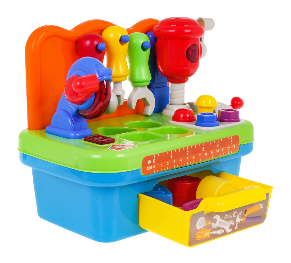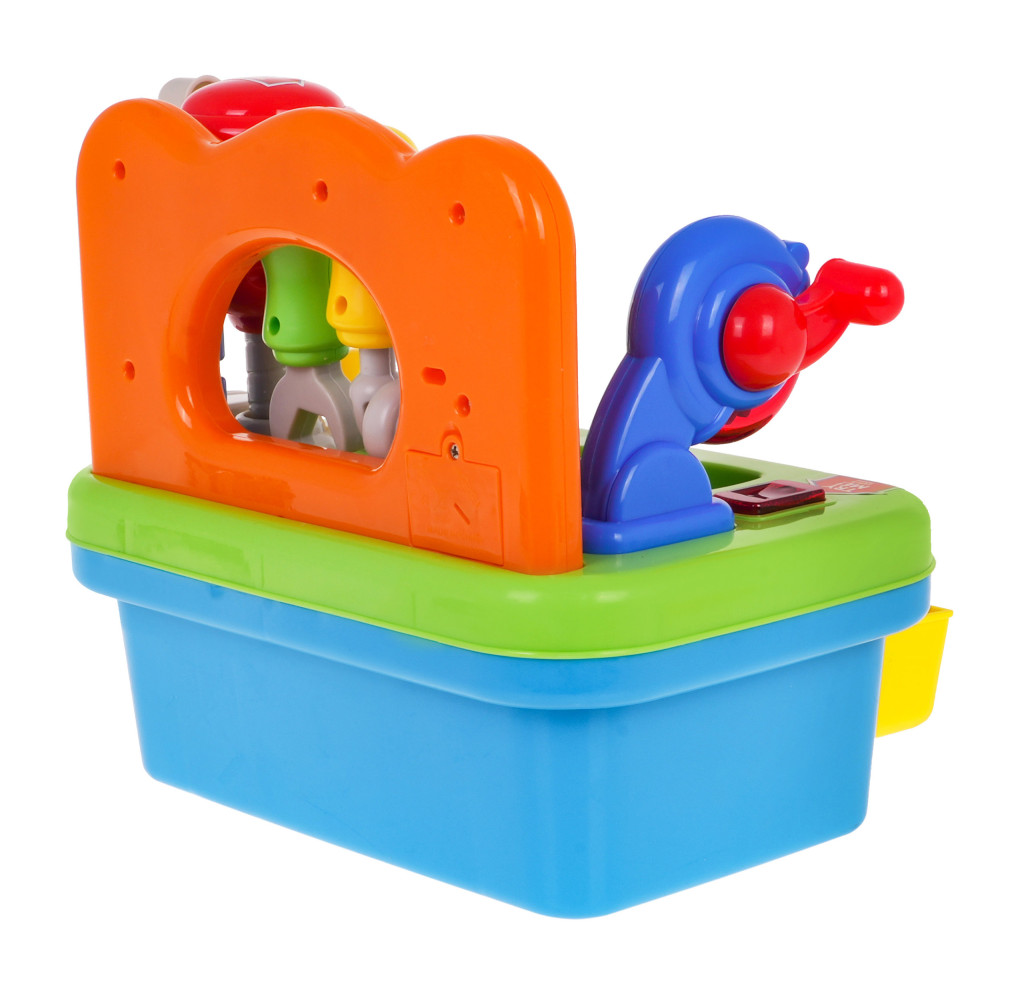 | | Multifunkcyjna, interaktywna zabawka z funkcją dźwięku i światła to propozycja dla dzieci od 24-go miesiąca życia. Warsztat majsterkowicza wyposażony jest w szereg rozmaitych funkcji. Znajdziemy tu obracającą się tarczową piłę oraz młot udarowy. Każde z narzędzi wyposażone jest w praktyczną rączkę, za pomocą której uruchomimy go. Na blacie warsztatu zamontowano imadło, które pozwoli naszemu maluszkowi nauczyć się odruchu przykręcania i odkręcania, czemu będą towarzyszyć odgłosy grzechotania. W warsztacie znajdziemy gwoździe do wbijania i śrubki do przykręcania. Dodatkowe wyposażenie to narzędzia: śrubokręt, klucz francuski i młotek, wszystko w proporcjach znakomicie nadających się do małych dziecięcych rączek. Warsztat to również znakomite miejsce do ćwiczenia umiejętności rozpoznawania kształtów i dopasowywania ich do siebie. Blat warsztatu wyposażono w sorter, znakomicie rozwijający umiejętności dziecka. Wszystkie elementy, które dopasujemy do odpowiednich otworów, znajdziemy w praktycznej szufladzie na spodzie zabawki. Warsztat zasilany jest bateriami typu 3 x AG13, baterie znajdują się w zestawie. Specyfikacja warsztatu: - żywe, przyjemne dla oka kolory, - obracająca się piła tarczowa ze światłem i dźwiękiem, - ruchomy młot udarowy ze światłem i dźwiękiem, - ruchome imadło z ruchem wysuwania i chowania, - otwierana szuflada do przechowywania akcesoriów warsztatowych, - sorter z kształtami, - możliwość wbijania gwoździ za pomocą młotka, - możliwość wkręcania i wykręcania śrubek za pomocą klucza lub śrubokrętu. |