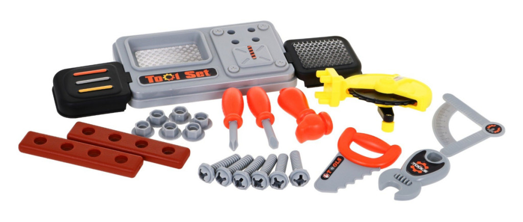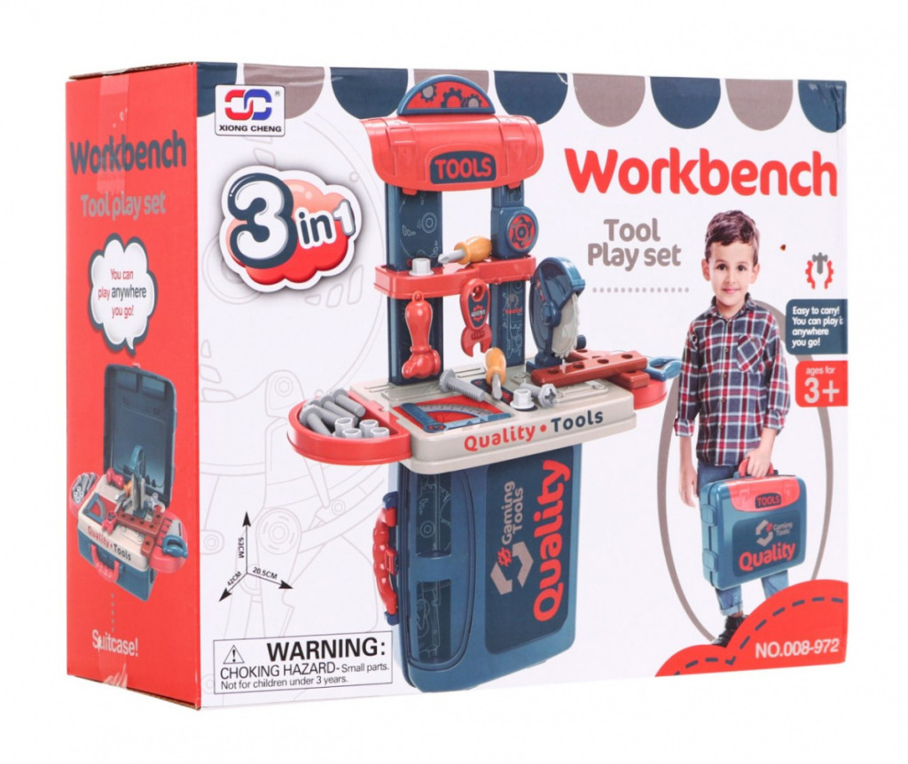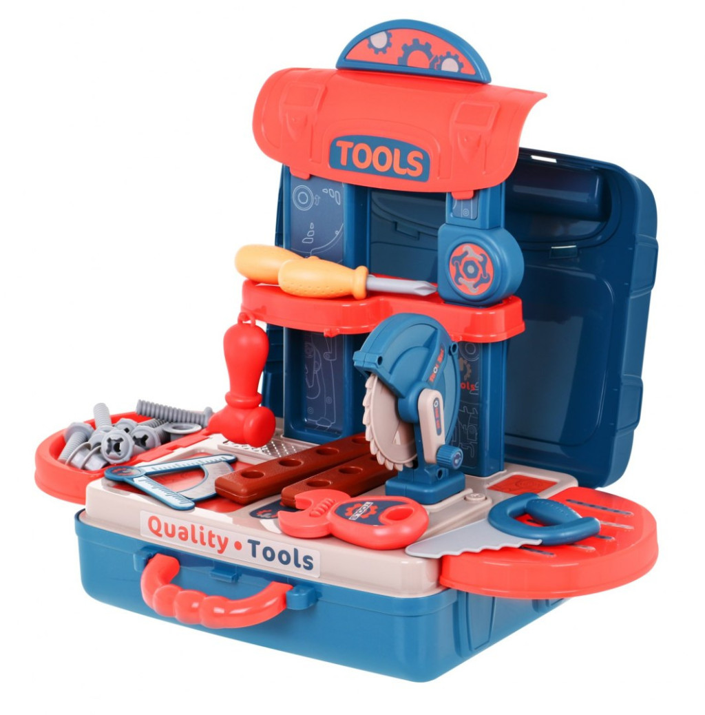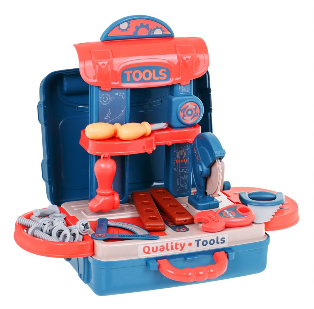 Zestaw narzędzi z walizką to zabawka dla dzieci powyżej 3 – go roku życia. Praktyczna walizka posiada wygodną rączkę do przenoszenia, jest za razem podstawą pod warsztat. Blat warsztatu można ułożyć na walizce położonej pionowo lub otwartej położonej na płasko.