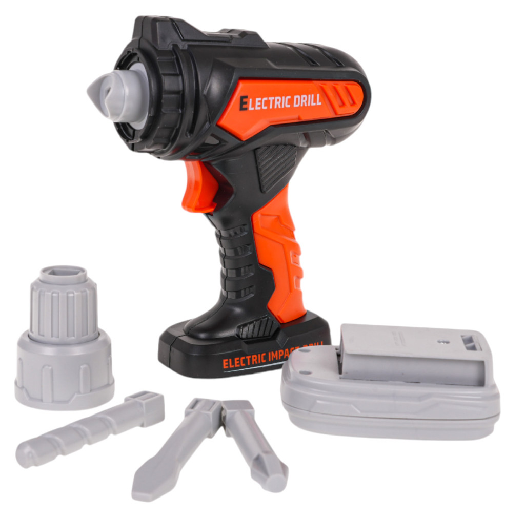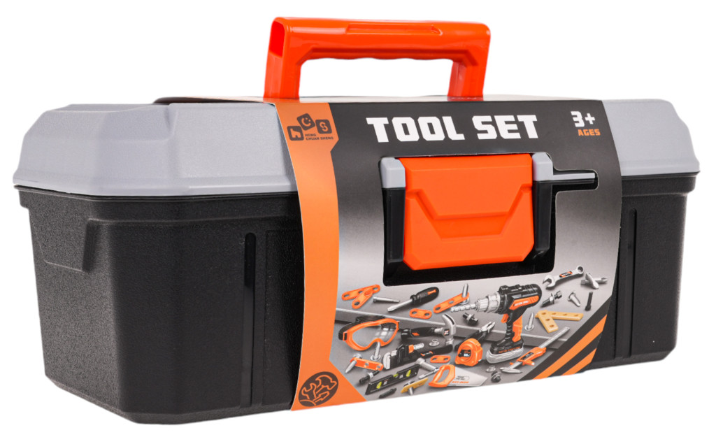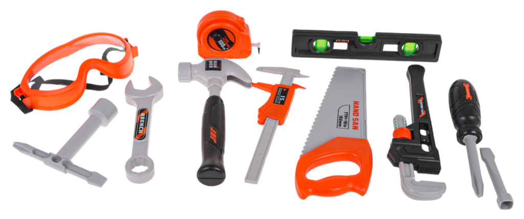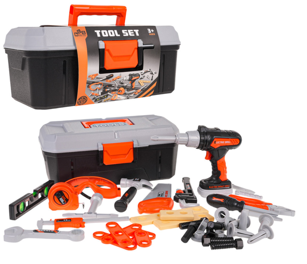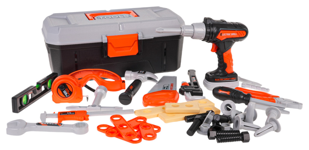 - skrzynka na narzędzia ok. 32 cm x 17 cm x 14 cm, - wiertarko-wkrętarka ok. 14,5 cm x 16 cm x 5 cm, - wymienne bity do wiertarki ok. 6,5 cm długości, - kombinerki ok. 15 cm x 5 cm x 1,5 cm, - okulary ochronne ok. 14 cm x 6,5 cm x 4 cm, - klucz oczkowo-płaski ok. 14 cm x 4 cm, - nasadka do śrubokręta ok. 8 cm x 3,5 cm, - wymienne bity do śrubokręta ok. 7,5 cm długości, - klucz do śrub ok. 11 cm x 9 cm, - młotek ok.17 cm x 8 cm, - suwmiarka ok. 17 cm x 4,5 cm, - metr ok. 5,5 cm x 6 cm, - piłka ręczna ok. 19,5 cm x 8 cm, - poziomica ok. 16,5 cm x 3,5 cm. |