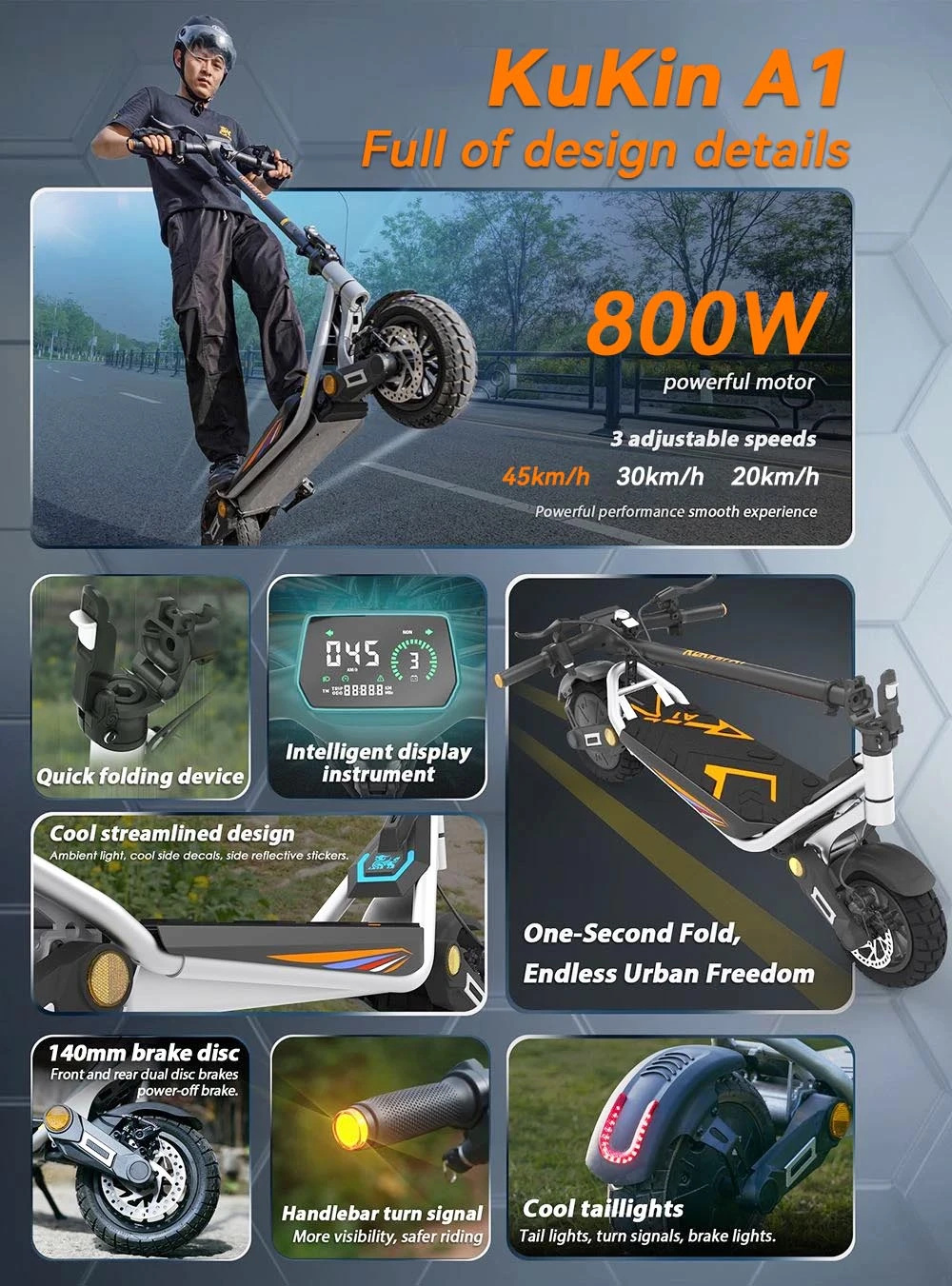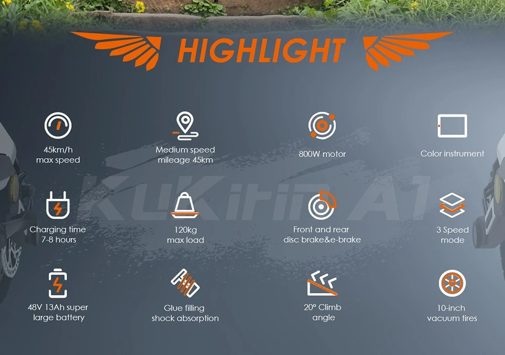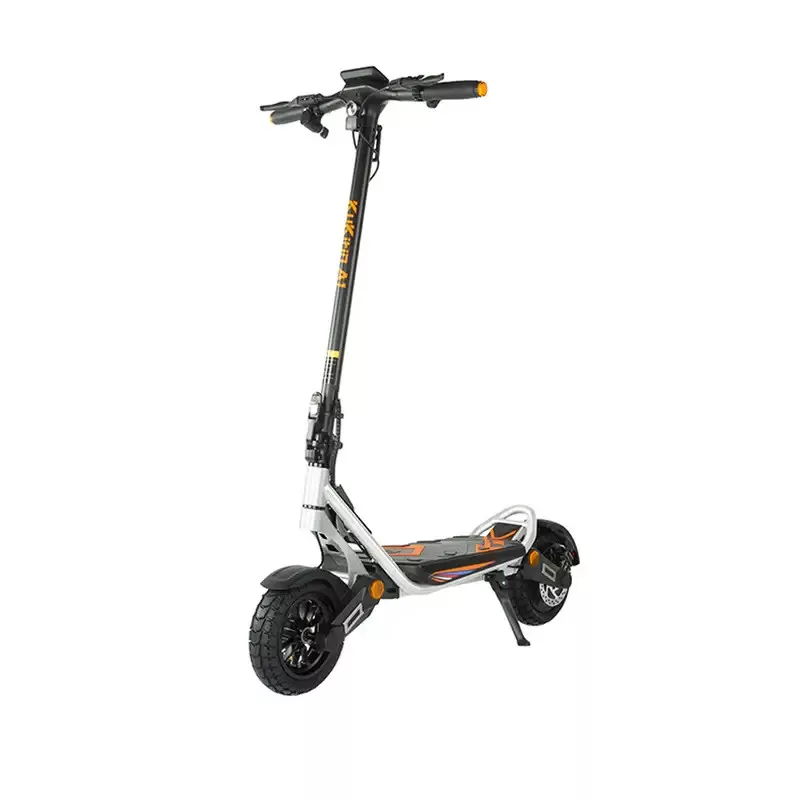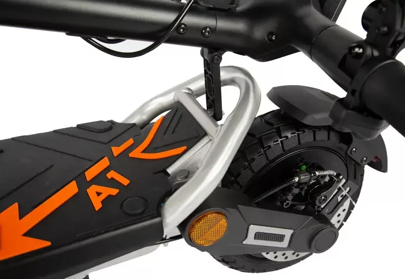 Kukirin A1 elektromos közlekedési eszköz, elektromos roller. Városi és vidéki közlekedésre kiváló, gyors, erős, dinamikus, strapabíró. Nagyságában kivitelezésében és minőségében felső középkategóriát képvisel a Kukirin A1 A hátsó kerék meghajtása, a teleszkópos felfüggesztése a nehéz terepet is jól veszi. Nem akadály számára a padkáról történő le illetve felhajtás, villamossínek és egyéb akadályok. A dupla első lámpája jó megvilágítást biztosít és a kiegészítő lámpái pedig jól láthatóvá teszik a rollert az éjszaki használat során.